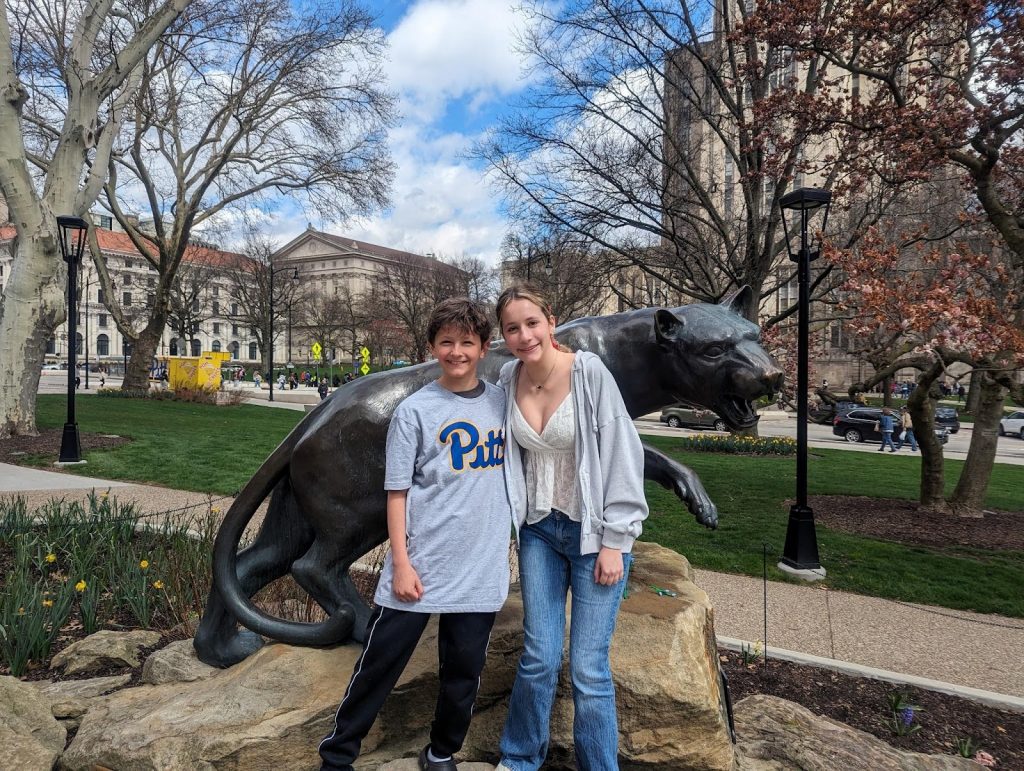 Sylvie is a junior at Albert Einstein High School. She started the college search this year and took her first unofficial tours while we were on spring break in Pittsburgh in March. We learned that if you post one family member outside a campus building with the dog while others are touring inside, you can gather lots of intel from undergrads who stop to ask if they can pet your dog.
